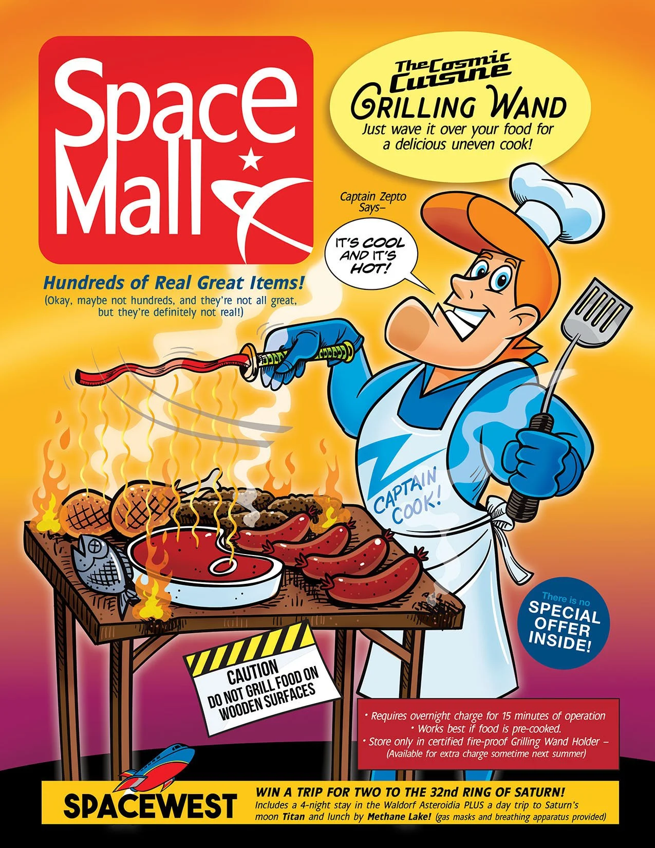 Shown: Cover of “Space Mall” catalog. Features wacky fake products.